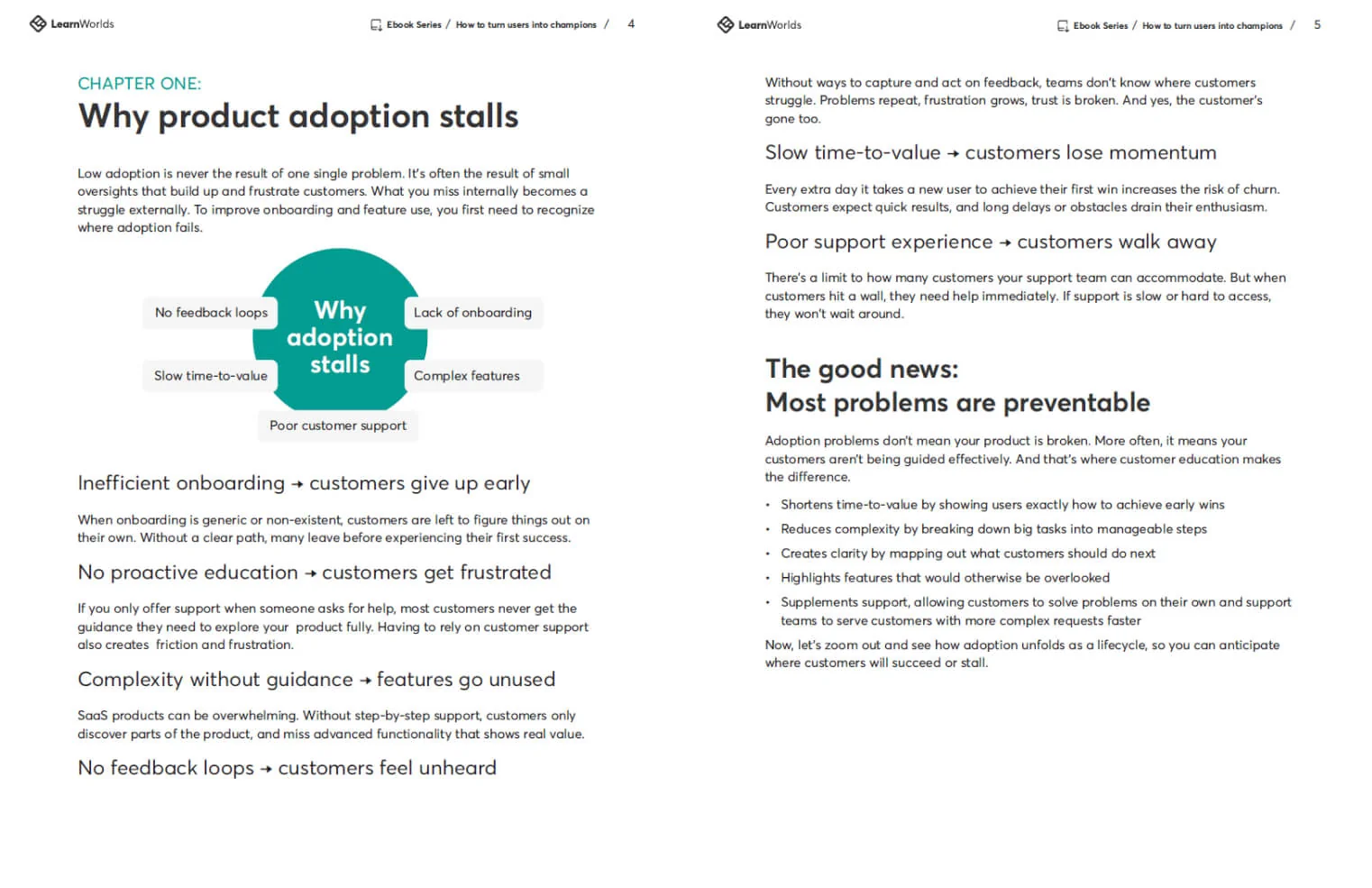 Adoption challenges are common in SaaS, but they’re not inevitable. This ebook shows you how to spot what’s missing, why SaaS product adoption stalls, and how to use customer education to fix it.