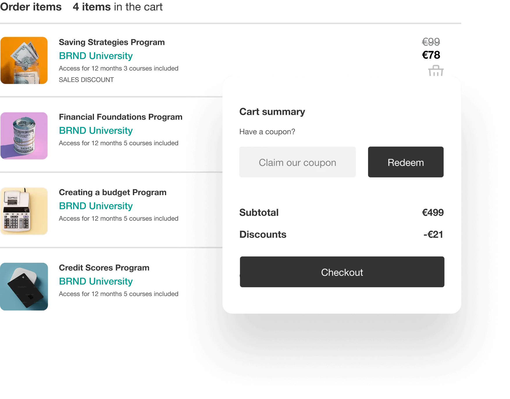 Just like your favorite e-shop, learners can add multiple items, apply best coupons, and check out once, boosting order value with zero friction.