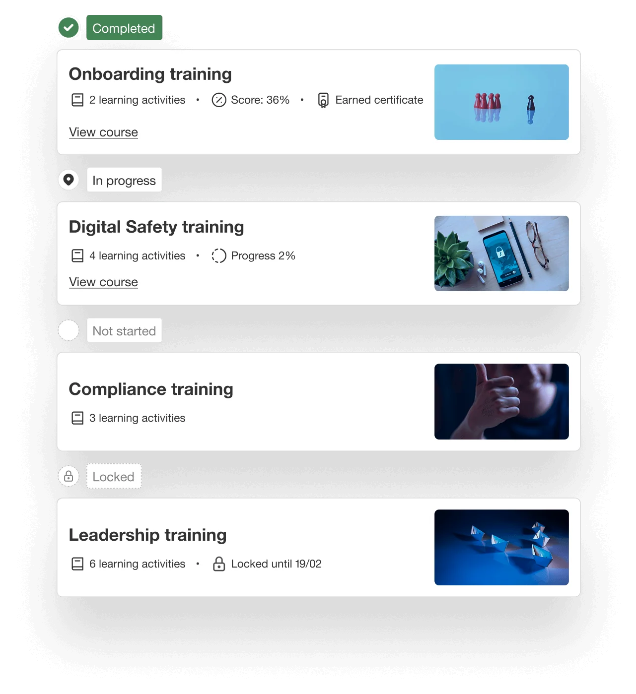 Package courses into Programs and check their progress in the dedicated dashboards, supporting learners in their learning journey.
