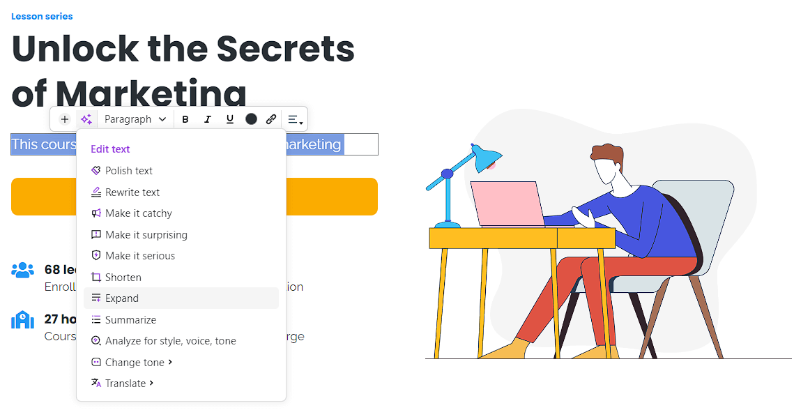 The content editor provides prompts to improve text across the platform. This includes course content, landing pages, or emails.