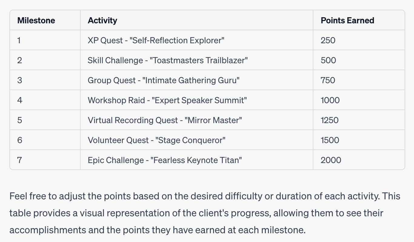 ChatGPT produced an excellent plan broken down into 7 milestones of increasing difficulty plus an activity. It started with Milestone 1, “Building confidence and self-awareness,” and the suggested activity was self-reflection journaling. Milestone 7, “Mastering the Fear,” presented the learner with the ultimate challenge of delivering a keynote or TED talk.