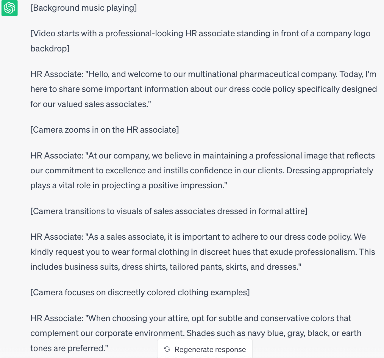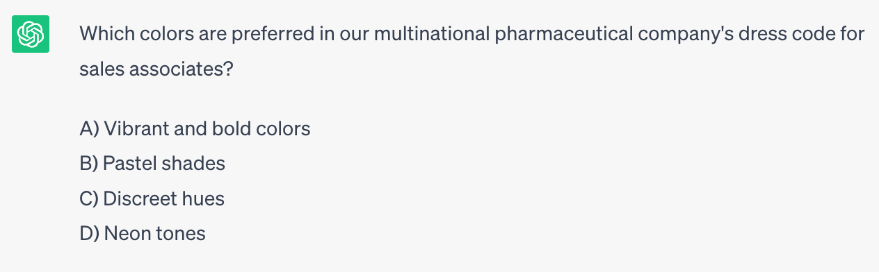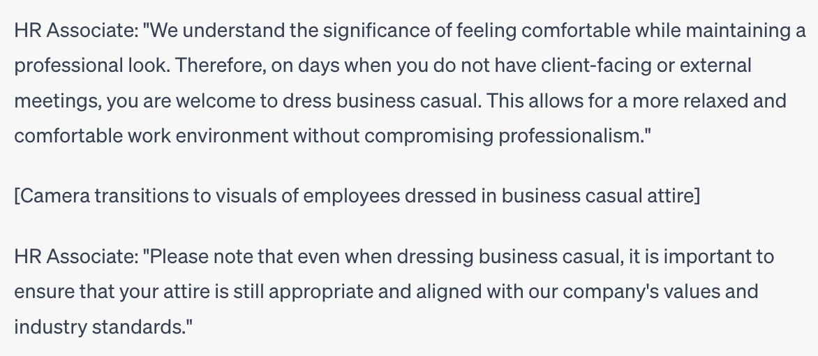 In the example above, ChatGPT went ahead and ahead and suggested that sales associates could dress business casual on days they don’t have client-facing meetings. While that’s very thoughtful, it may not actually be something the employer agrees with.