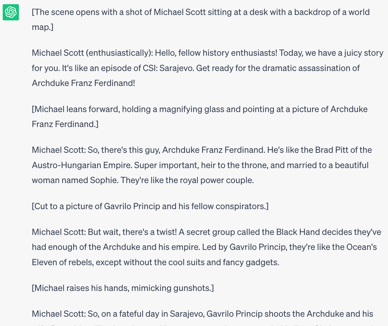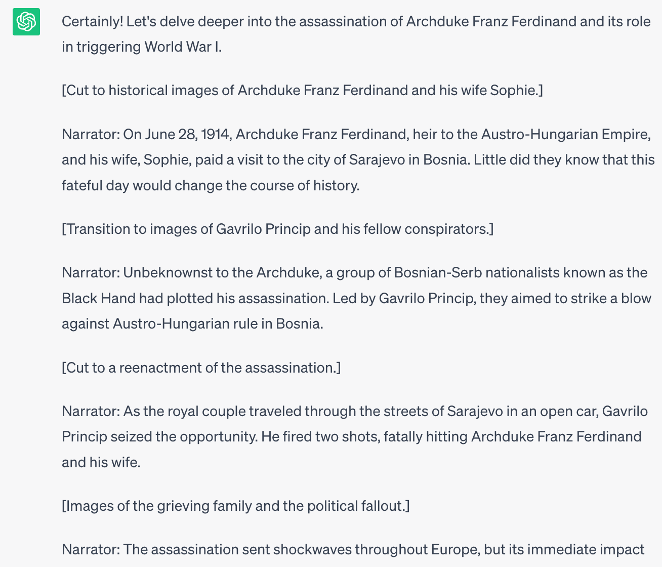 In the example we described above, a lot happened during World War I. So, continue the conversation with ChatGPT under the same thread and discuss one event only instead of going over the entire series of events. Remember to be specific and guide it toward what you want it to discuss.