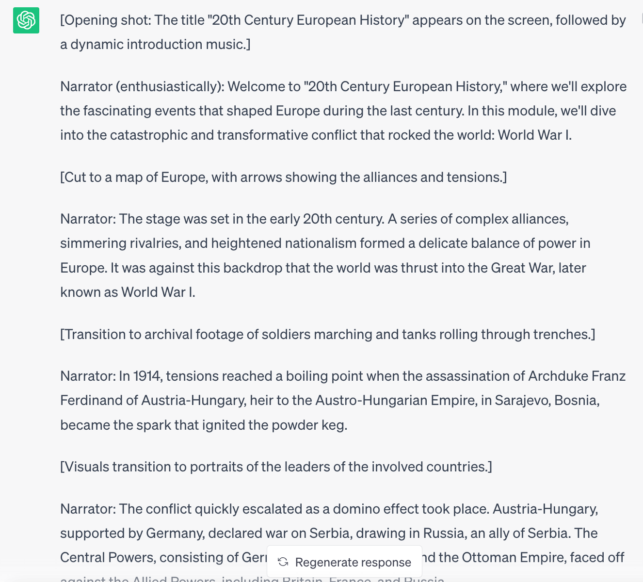 ChatGPT generated a script with historically accurate information (although since the tool is not a fact checker, we strongly advise you to always double-check the generated output for data accuracy, to ensure it’s not one of its hallucinations), popping in suggestions for visuals. Because we said the course is for young adults, the script read rather enthusiastically.