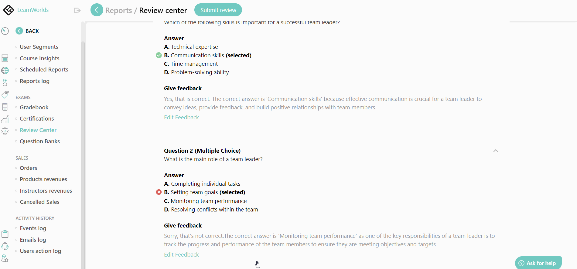 Absolutely! When it comes to providing feedback on assessments, our LearnWorlds platform offers a dynamic solution.