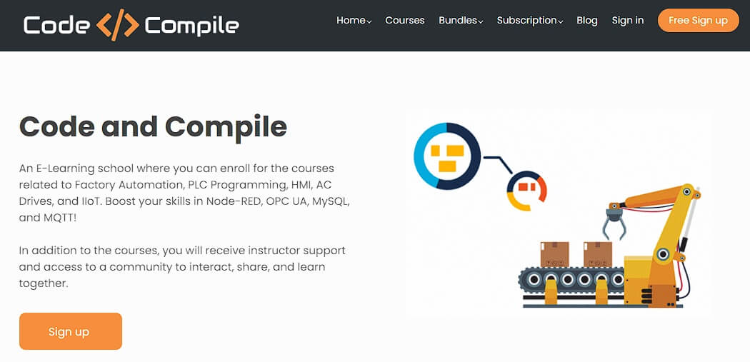 Code and Compile teaches Factory Automation, PLC Programming, HMI, AC Drives, and IIoT. Boost your skills in Node-RED, OPC UA, MySQL, and MQTT!