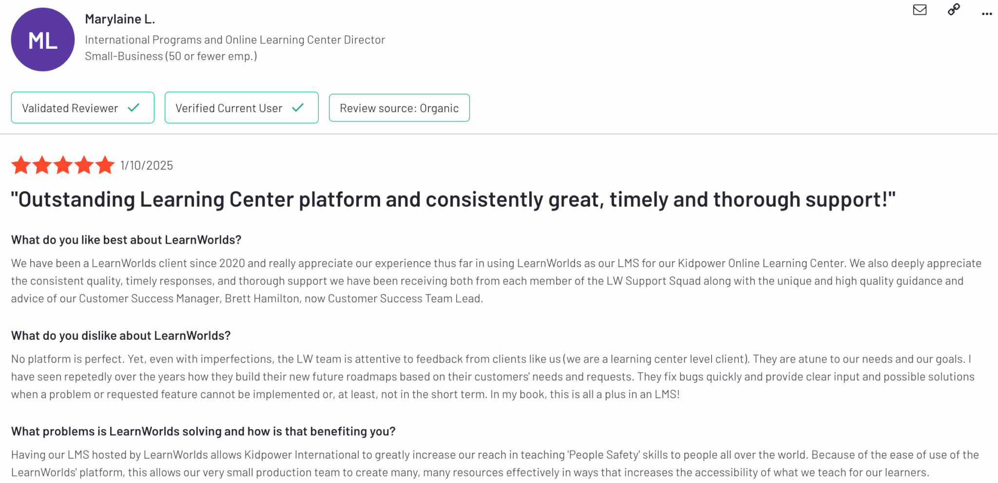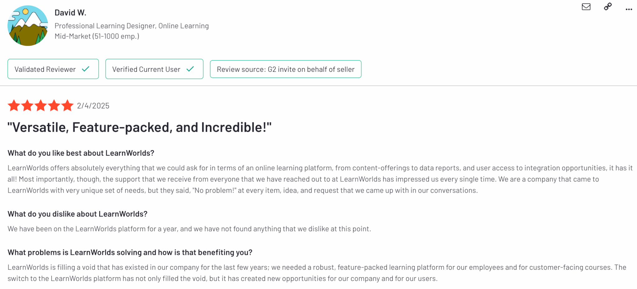 LearnWorlds is rated 4.7 out of 5 on G2. Our customers appreciate the wide range of features offered.