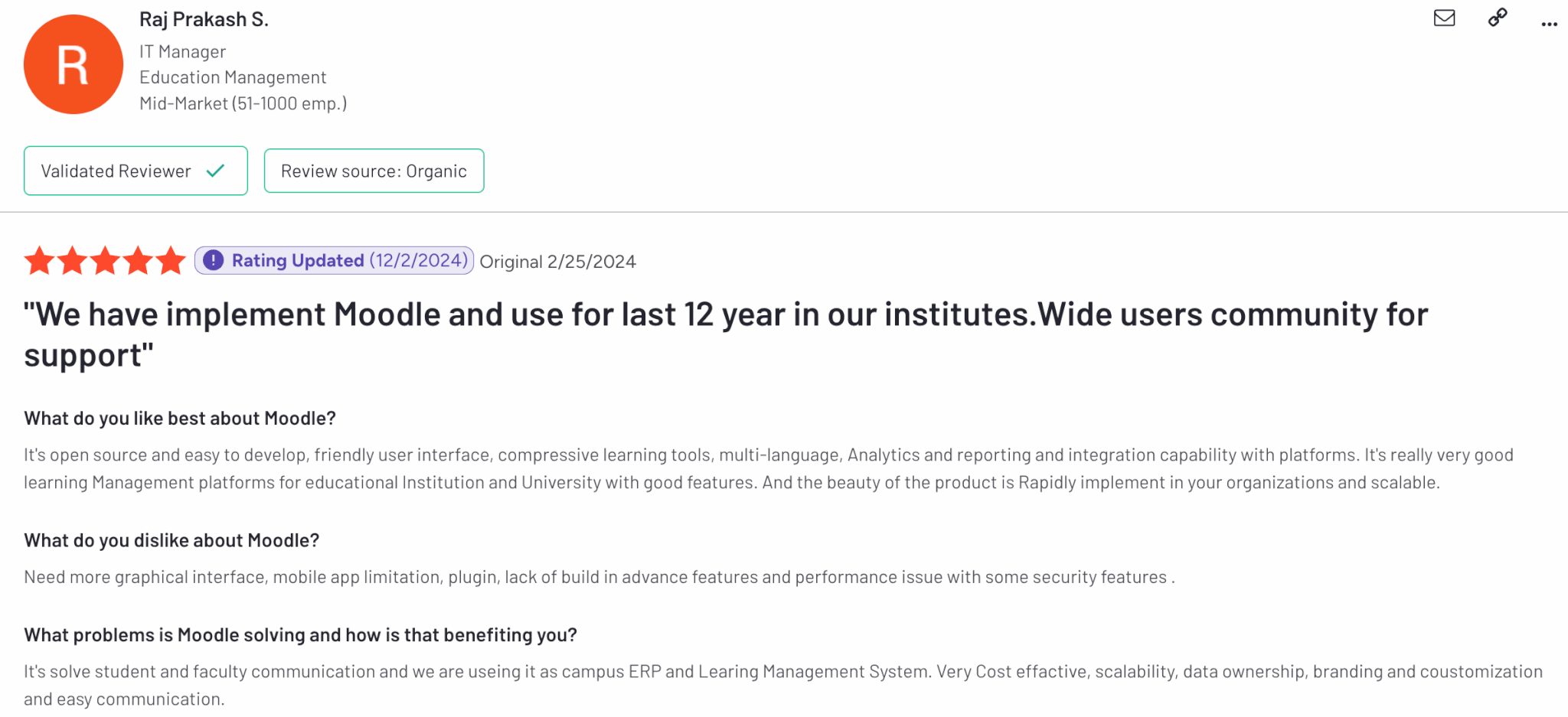 Moodle is rated 4.1 out of 5 on G2. Users often praise the multiple integrations and customization capabilities, but a common complaint is the complex UI and steep learning curve of the tool.