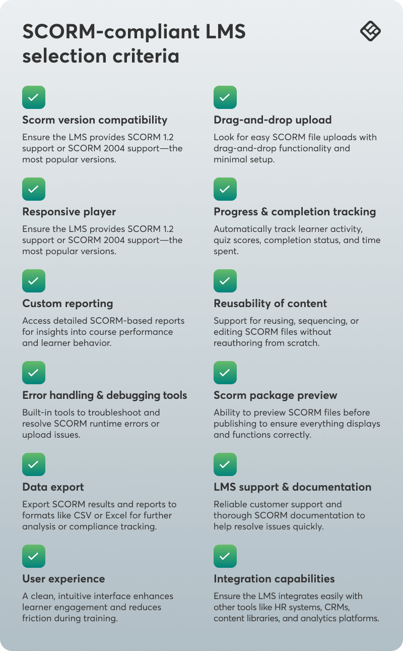 Choosing a SCORM-compliant LMS software is a game-changer in terms of content quality, reporting, and flexibility. Here’s your go-to list when choosing a SCORM-compliant LMS: