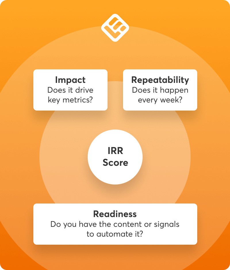 The Impact × Repeatability × Readiness (IRR) score is a simple way to identify your most urgent need and decide on what to automate first in your customer success workflows.