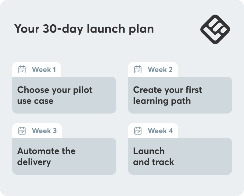 - Don’t strive for perfection from day one. Start with your most urgent use case, create your first learning path, set automations to automate delivery, and launch the program. Monitor results a few weeks later.