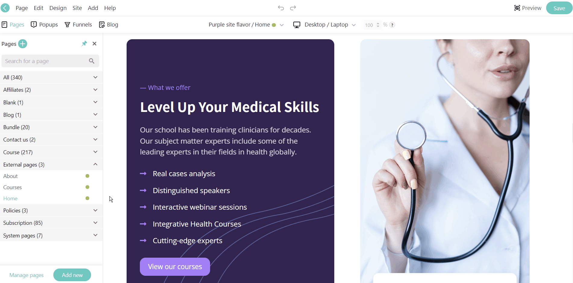 You can then, of course, edit the page by altering the text/images and adding new sections or widgets. You can also add details like page name, page slug, page group, etc.