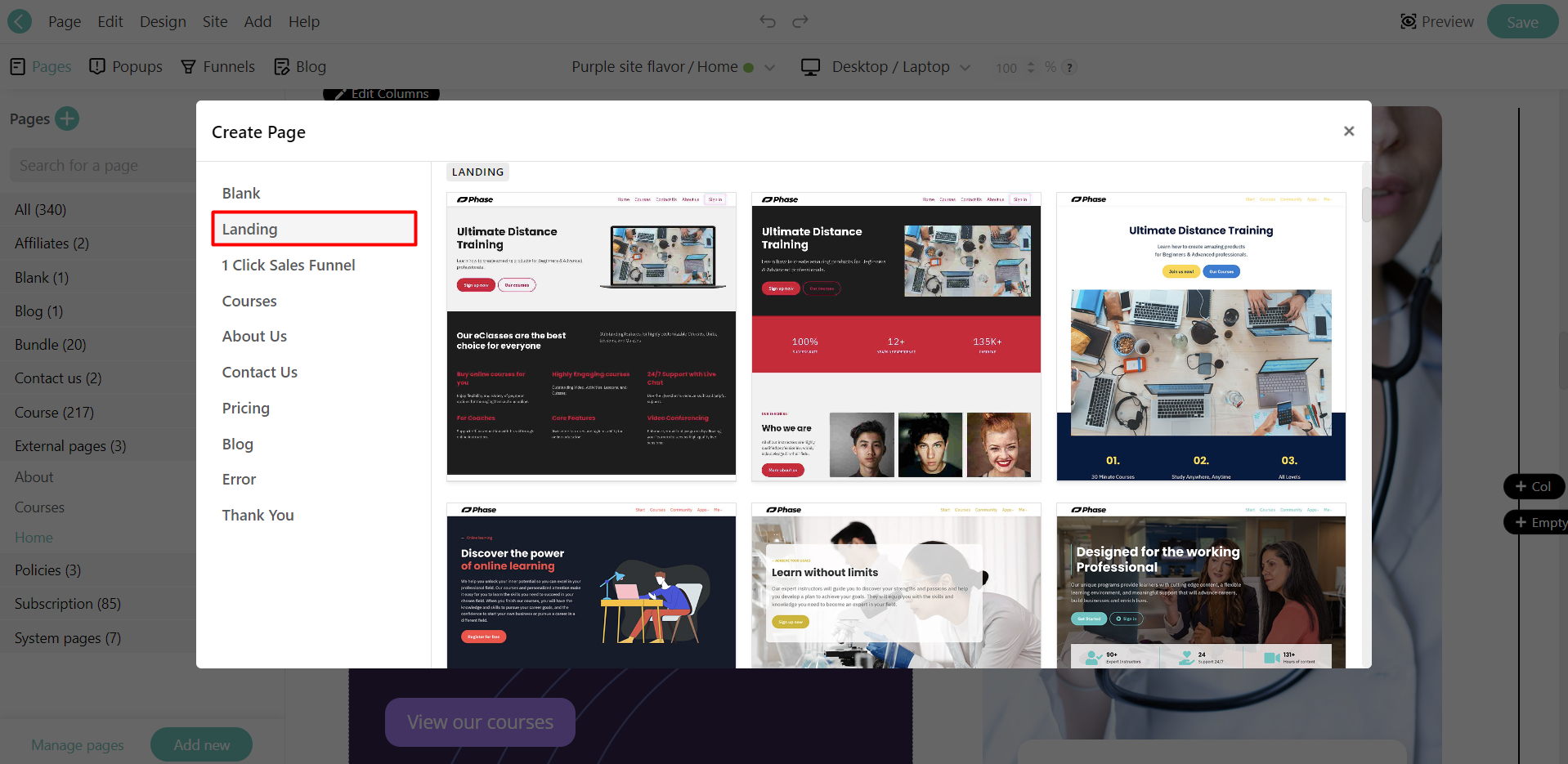 You will be given the option to choose either an empty page or one of our different ready-made Page Templates, with a variety of options, including the landing page template.