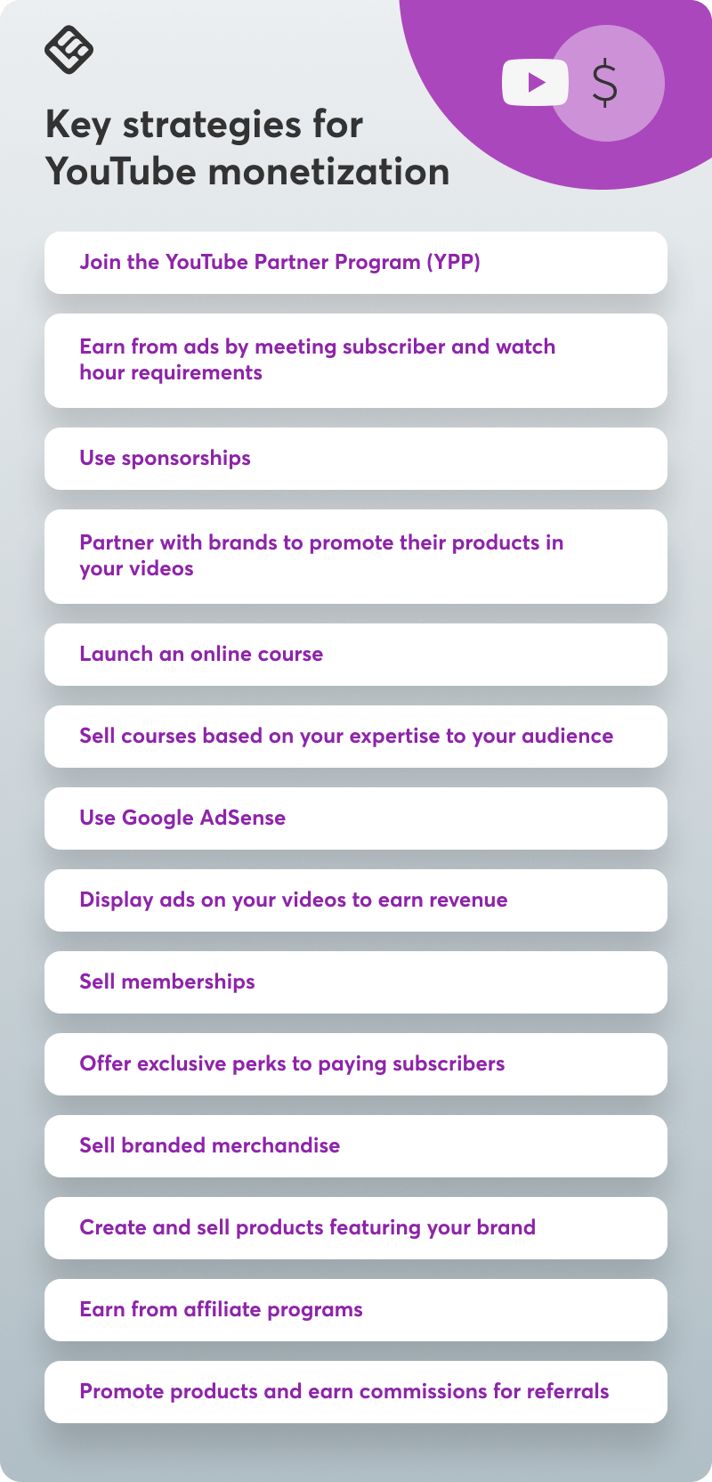 How do you earn money on YouTube as a creator? First of, you can join the YouTube partner program (YPP). This program enables you to monetize your content with ads which is the easiest way to make money on YouTube, channel memberships, Super Chats, and selling merchandise. Your earnings may depend on several factors, such as video views, audience demographics, and ad engagement, and you get to receive a percentage of the ad revenue generated.