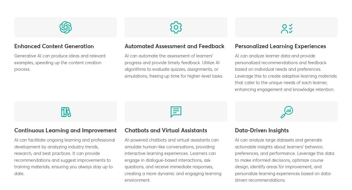 ⚙️Automated assessment and feedback: Stop grading things by hand. AI can check how well people are learning and give them feedback when they need it.
