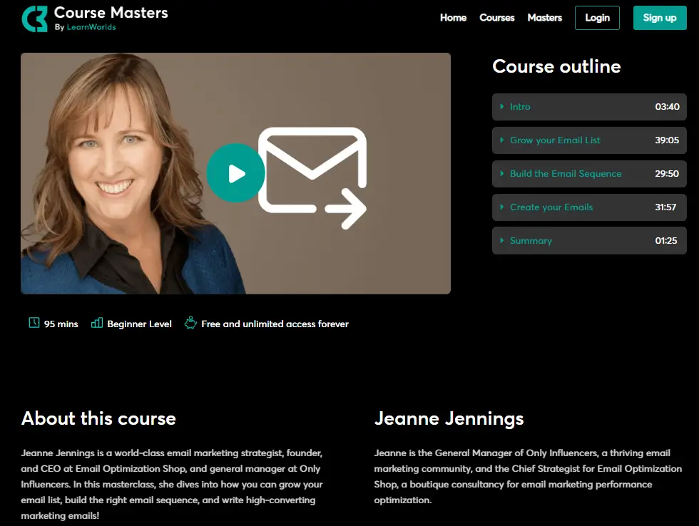Let’s take as an example the email marketing masterclass. In this course, the founder and CEO at Email Optimization Shop and General Manager at Only Influencers, Jeanne Jennings, shares actionable copywriting tips, so course creators can maximize the impact of their email marketing strategy.