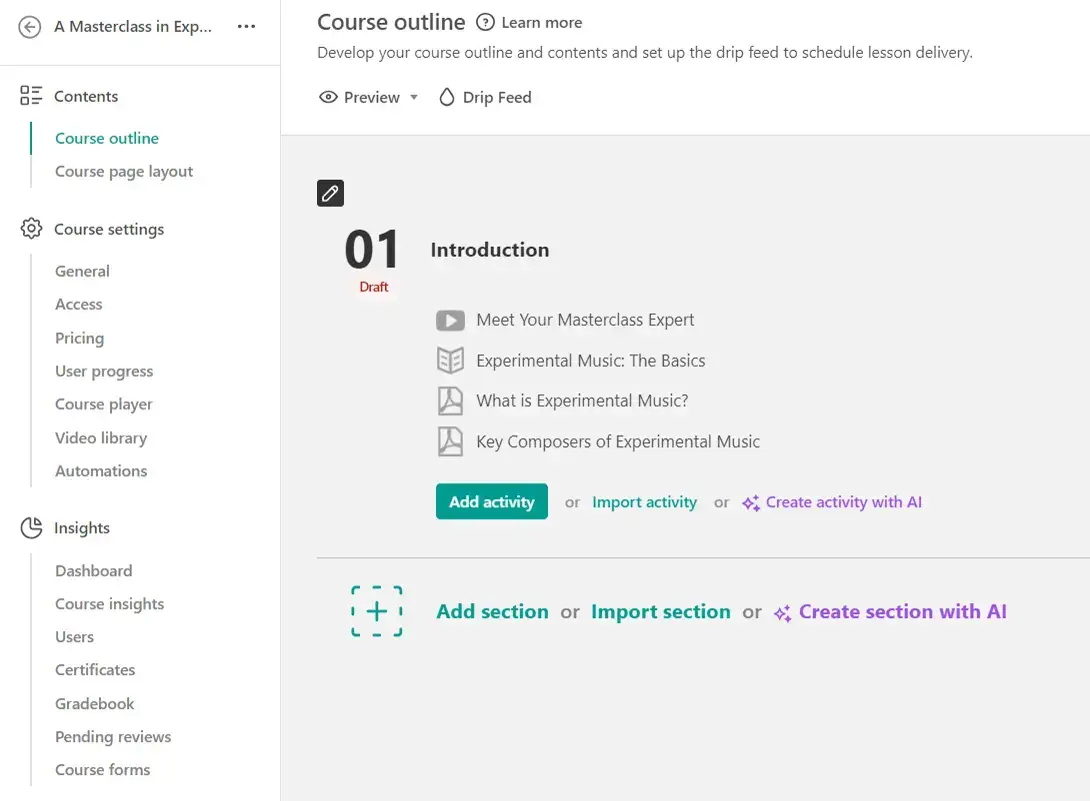 Once you choose your preferred content creation option, go ahead and give a title to your first section, a description, choose the type of access, and click ‘Save’. Doing so will take you to the Course Outline.