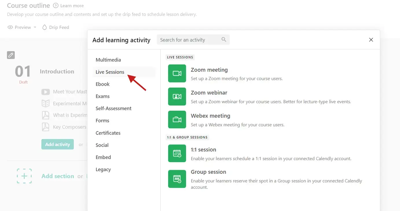 To do this, click on ‘Add Activity again, but this time go to the ‘Live Session’ tab. From there you have 3 options – either to schedule a live Zoom Meeting, Zoom Webinar, or Webex Meeting.