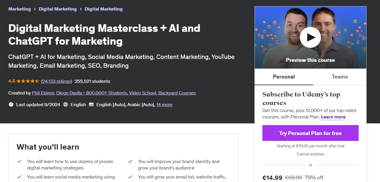 In the following example, Udemy presents lots of information regarding the training. It offers a simple – yet effective course description with a detailed outline of the learning outcomes, along with the instructor’s name.