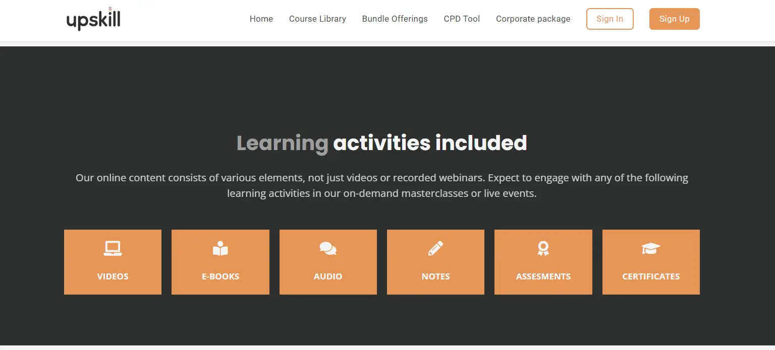 Upskill teaches learners various subjects that fall under the professional development umbrella. With live events, masterclasses, training resources, and on-demand content, Upskill helps its students develop their technical and professional skills and achieve more in their careers. Their online content includes videos, eBooks, audio, notes, assessments, and certificates.