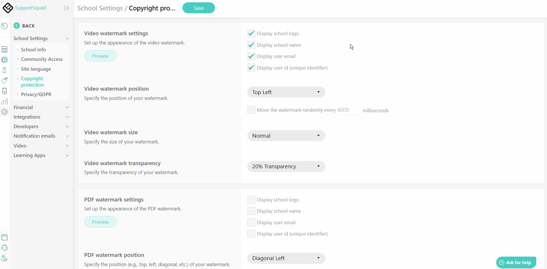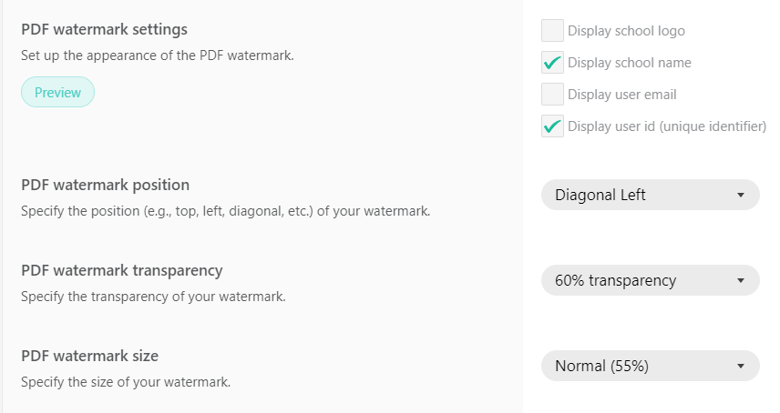 You can find a complete guide on how to enable video watermarking & PDF stamping on LearnWorlds here.