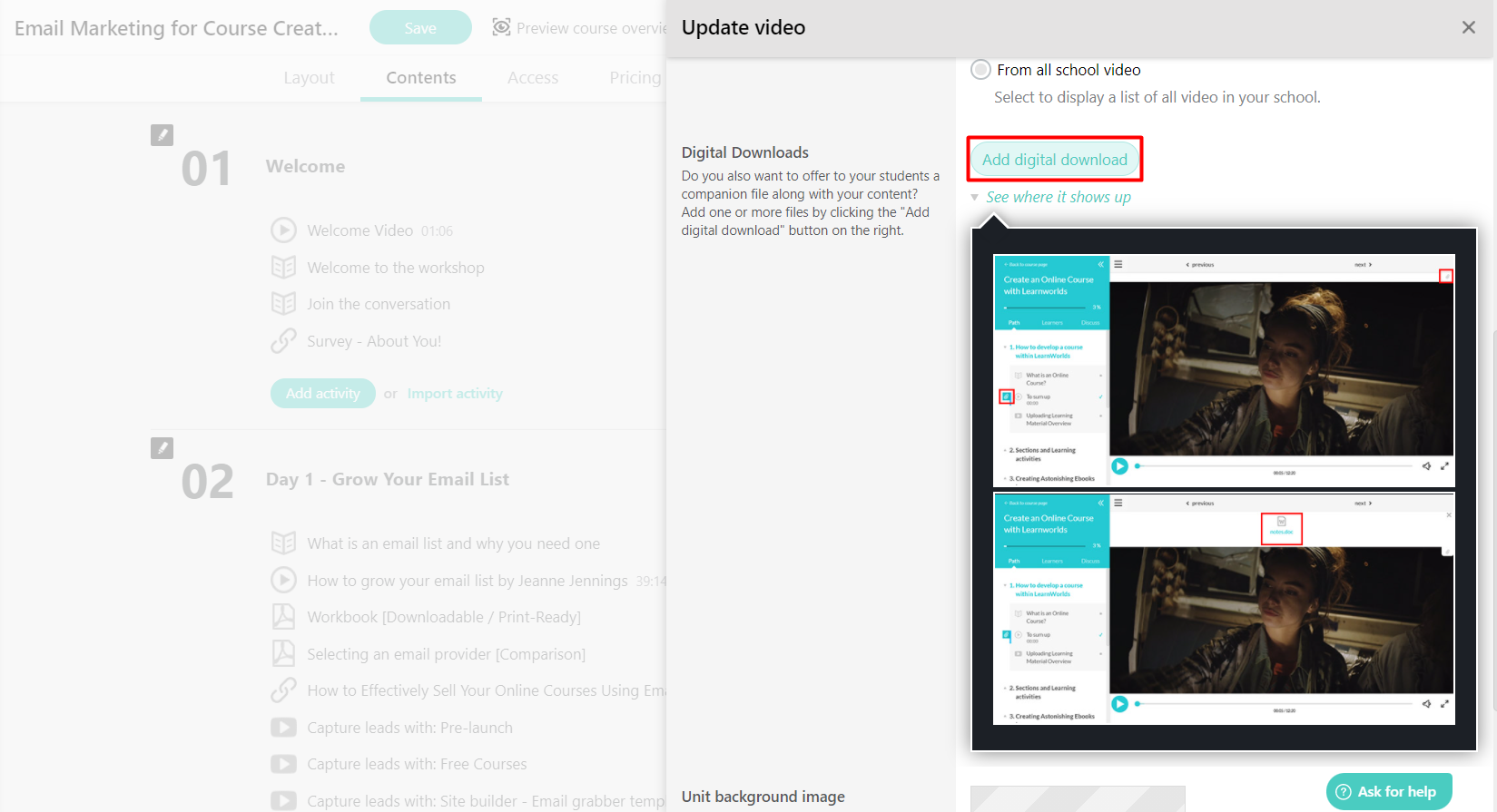 *A sufficiently sophisticated and motivated malicious actor could still get the original video, without the watermark, by using special software. Unfortunately, nothing can be done here. To watermark a source video, you would still need to use special video editing software to add your logo & name to the video before uploading it to LearnWorlds.