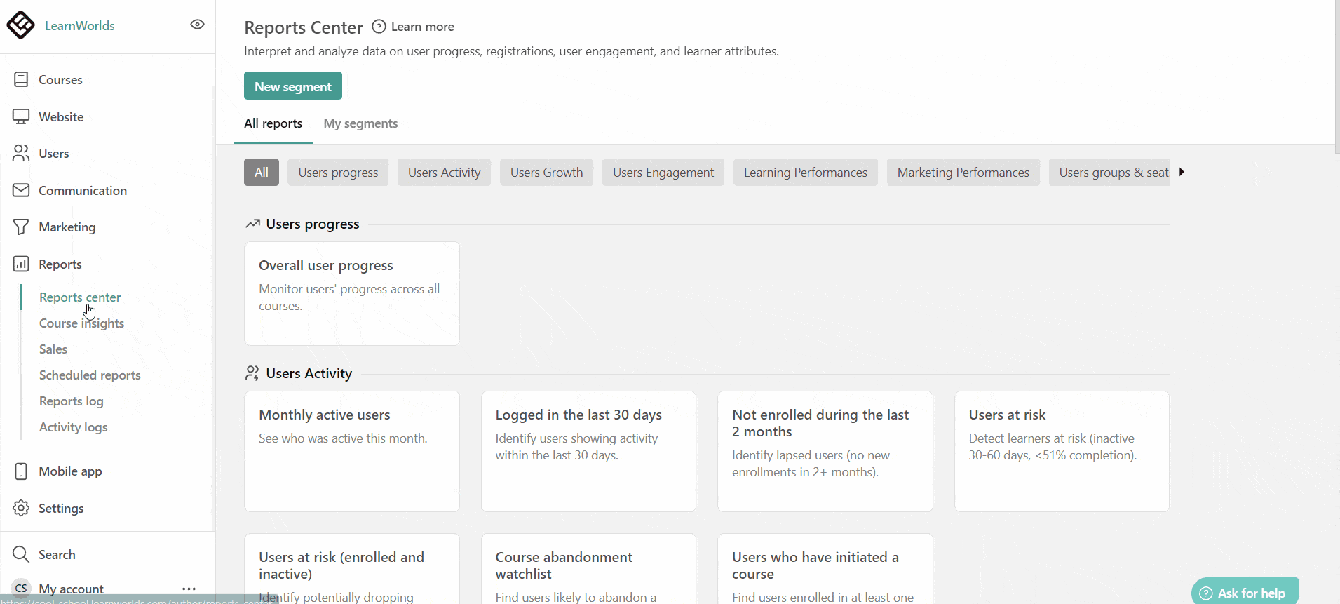 LearnWorlds goes beyond that and offers insights into every aspect of learner behavior and course performance, including sales. With intuitive dashboards, critical data is available at a bird’s view—plus, all reports are customizable and some can be scheduled as well.