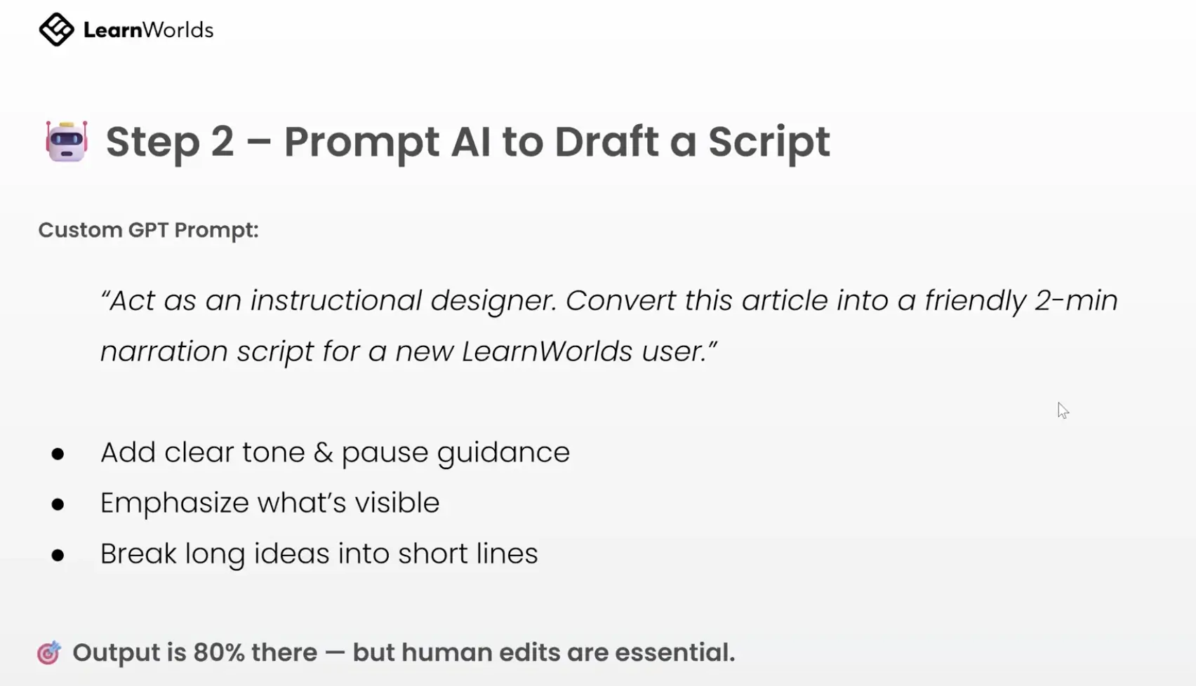 | From script with bullets to export | Includes AI prompt crafting, reviewing, syncing narration |