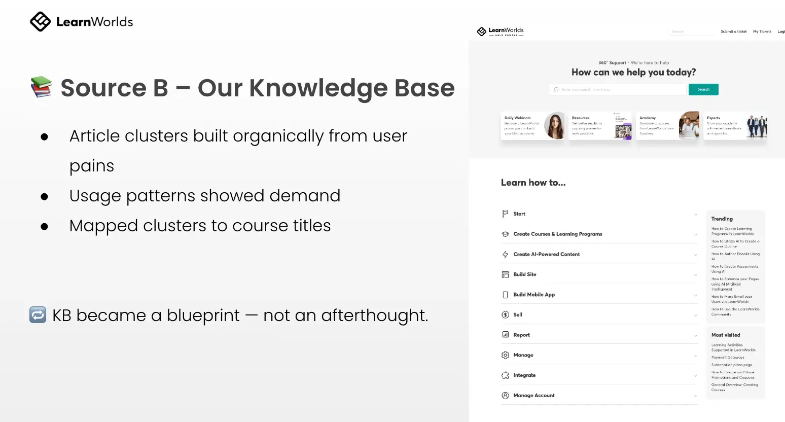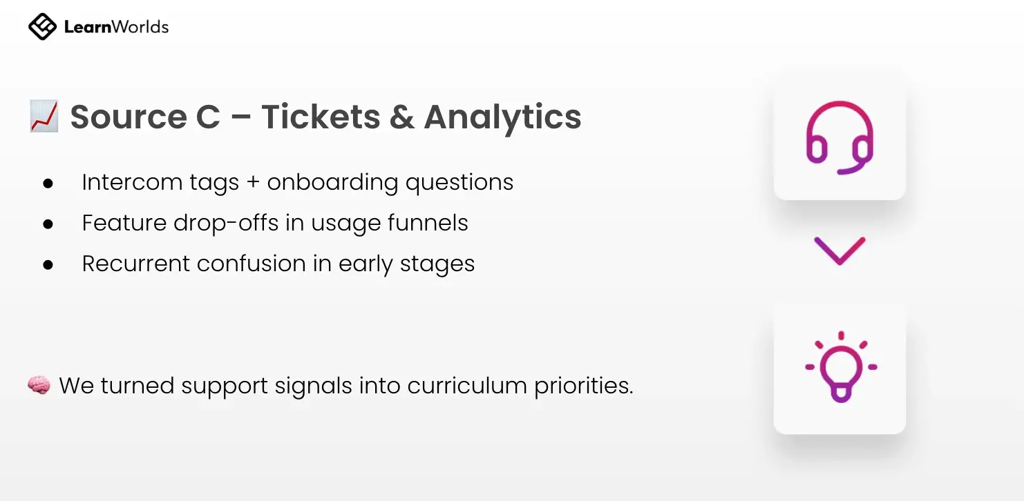 We fed AI with a large set of data from our product analytics and support tickets to identify feature drop-offs, common questions, and points where customers get confused during onboarding. We turned support signals into curriculum priorities.