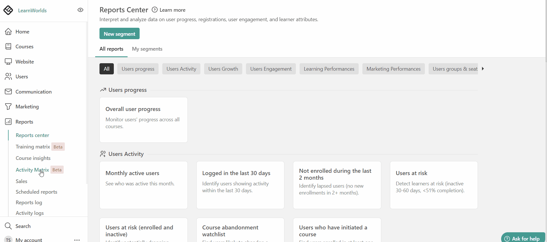 As for training tracking, the Reports Center allows you to track overall user progress across all courses using advanced filters and user segments. You can use either predefined segments or create custom user segments of your own. User progress reports can be exported and scheduled for delivery.