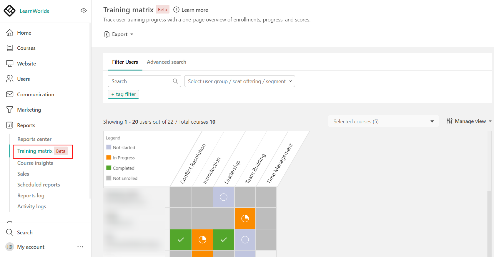 You can also check user progress via the Training Matrix—a dynamic visual chart that provides a detailed overview, all in one page, of who is enrolled in a course, their progress, and their score.