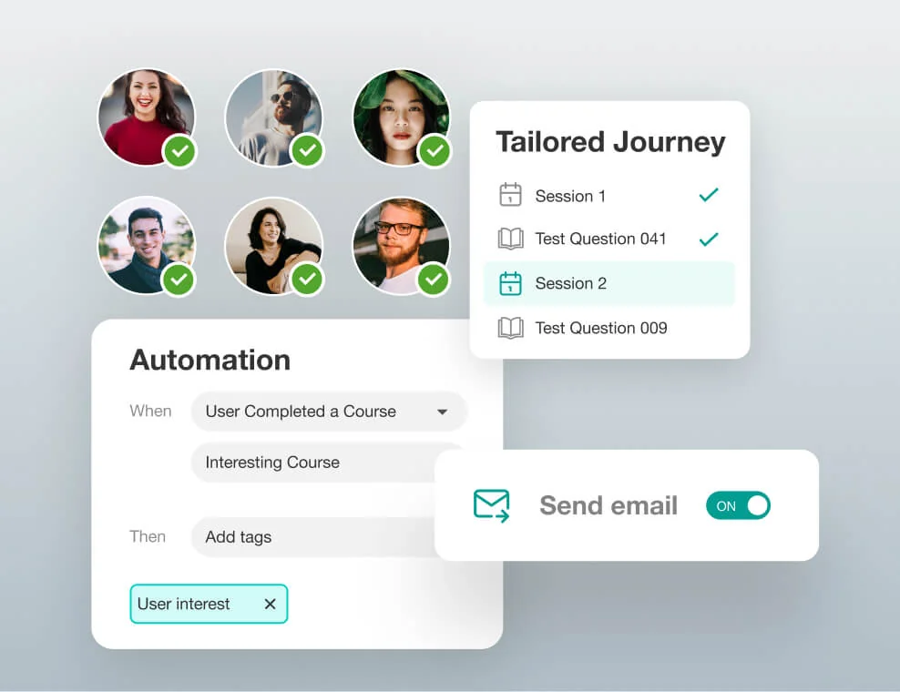 Create custom learning paths that are relevant to users’ unique journeys. Leverage tags to automatically enroll users into selected courses after sign-up or register them into bonus courses after they complete a training program.